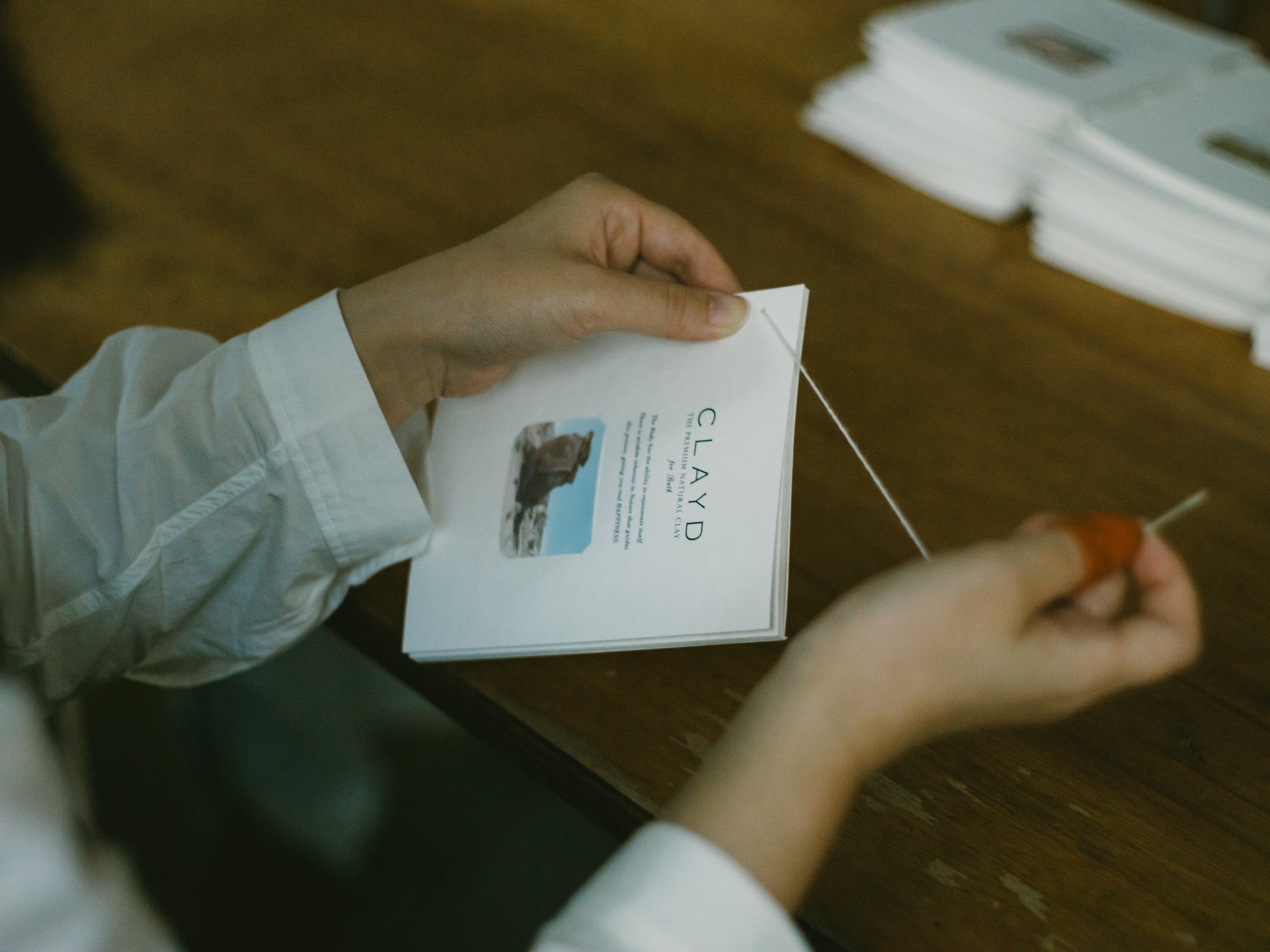 パッケージの和綴じ製本は、すべて手作業で行われています。